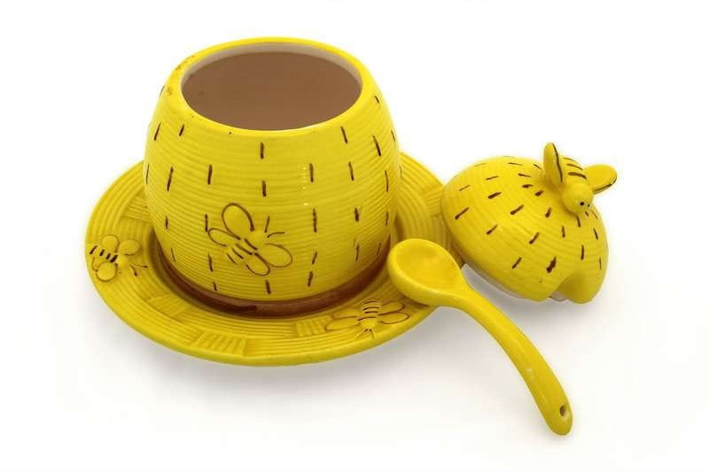Pojemnik ceramiczny na miód z podstawką i łyżką to przepiękny, a zarazem praktyczny wyrób ceramiczny, który znakomicie nada się na oryginalny prezent nie tylko dla Pszczelarki lub Pszczelarza, ale także fana miodu i sympatycznych, pracowitych owadów. Zestaw posiada uroczy, żółto-brązowy kolor, dzięki czemu pełni także funkcję wizualną, znakomicie dopasowując się do wystroju niemal każdej kuchni.