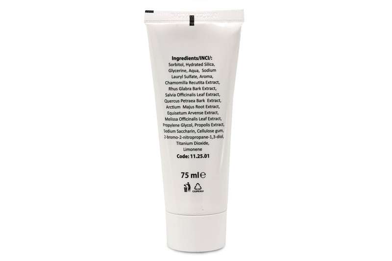 Sorbitol, Hydrated Silica, Glycerine, Aqua, Sodium Lauryl Sulfate, Aroma Chamomilla Recutita Extract, Rhus Glabra Bark Extract, Quercus Petraea Barkt Extract, Salvia Officinalis Leaf Extract, Arctium Majus Root Extract, Equisetum Arvense Extract, Melissa Officinalis Leaf Extract, Propylene Glycol, Propolis Extract, Sodium Saccharin, Cellulose gum, 2-bromo-2-nitropropane-1,3-diol, Titanum Dioxide, Limonene