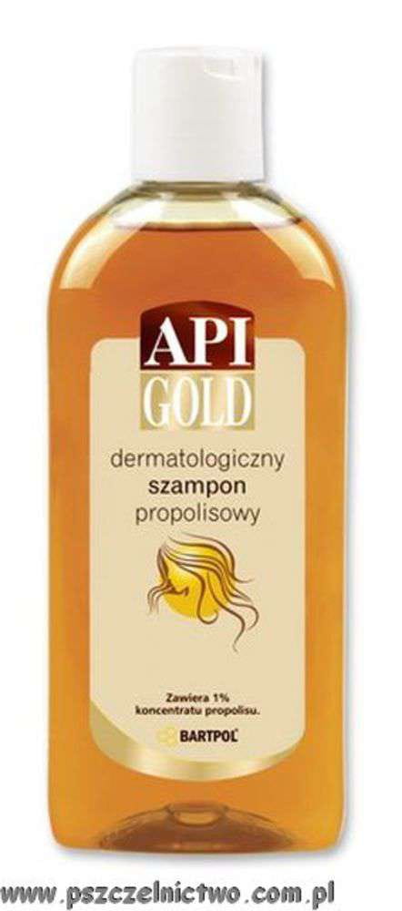 Api Gold - szampon do włosów z propolisem jest kosmetykiem do zadań specjalnych, o działaniu dermatologicznym. Swoje właściwości lecznicze zawdzięcza zawartemu w nim wysoko aktywnemu biologicznie ekstraktowi propolisu. Receptura szamponu oparta jest na starannie dobranych składnikach myjących. Polecany jest głównie osobom z różnymi dolegliwościami dermatologicznymi, m.in. ze zmianami zapalnymi, grzybiczymi oraz długotrwałym łupieżem. Propolis, czyli kit pszczeli znany jest z działania bakteriobójczego i ochronnego. Dzięki bogatym właściwościom przeciwłupieżowym składników aktywnych i substancjom myjącym włosy oraz skóra głowy zostają dokładnie oczyszczone.