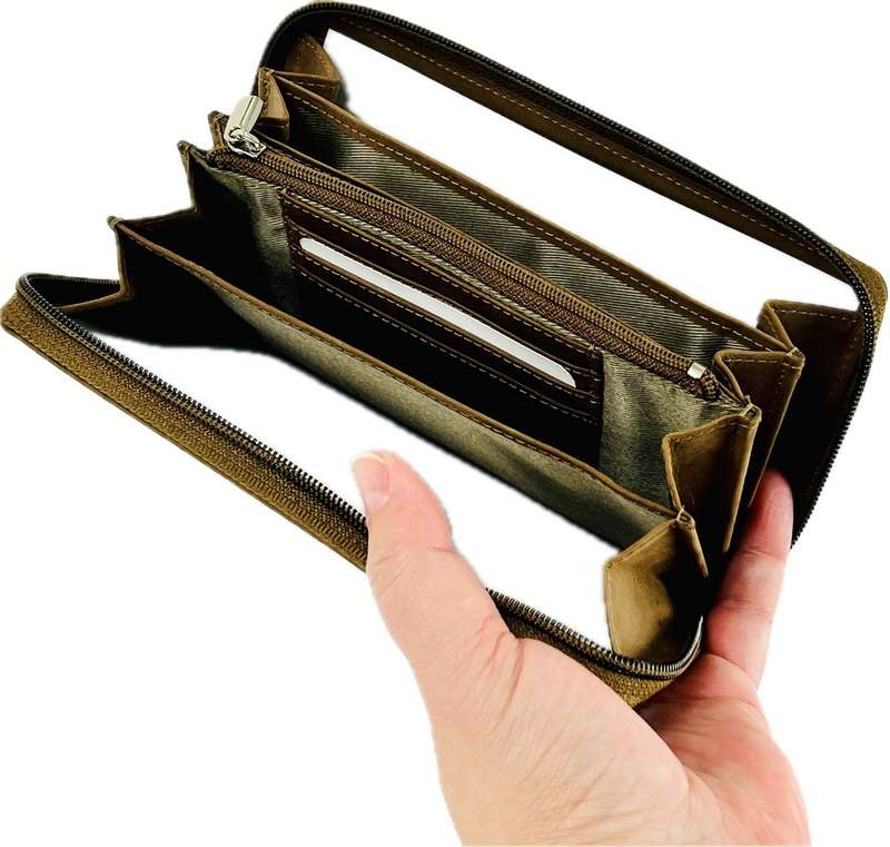 - Funkcjonalność: duży rozmiar z mnóstwem kieszonek i schowków na karty, banknoty, monety oraz dokumenty.