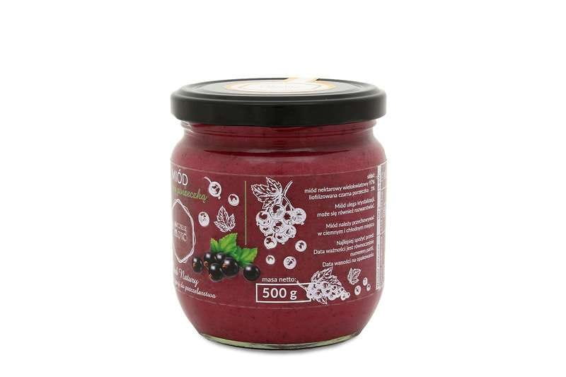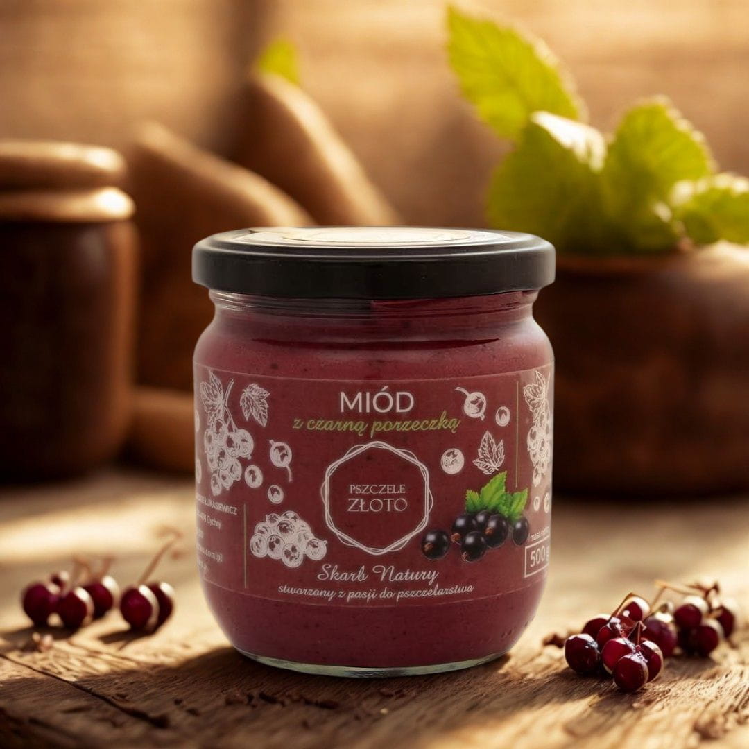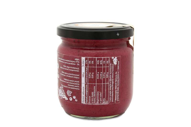 Wyśmienity miód z czarną porzeczką. Miód wielokwiatowy wzbogaciliśmy liofilizowanymi owocami czarnej porzeczki i uzyskaliśmy nieprawdopodobnie pyszny miodzik. Miód z czarną porzeczką to doskonały dodatek do musli, owsianki czy deserów. Równie doskonale smakuje na naleśnikach czy racuszkach. Nie można mu się oprzeć. Poprzez liofilizację owoce zachowały kolor, smak i witaminy.
