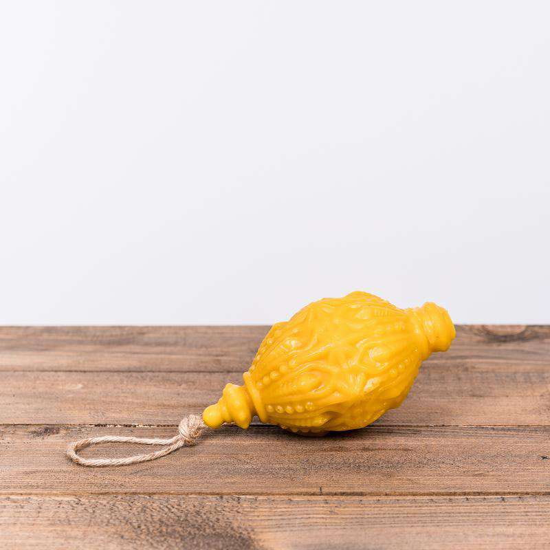 Zawieszka woskowa Bombka Świąteczna to ręcznie odlewana ozdoba choinkowa, która świetnie udekoruje świąteczne drzewko w czasie Bożego Narodzenia. Błyszczący, żółty wosk ożywi zieleń gałązek, a z czasem zmieni trochę barwę, co nada mu jeszcze bardziej naturalnego wyglądu.